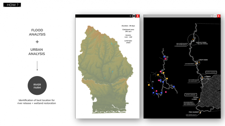 In order to locate the best places for the river farm to effectively utilize flood waters, a flood analysis and urban analysis are conducted. Here we’re able to locate the sweet spots for the farming plots.
