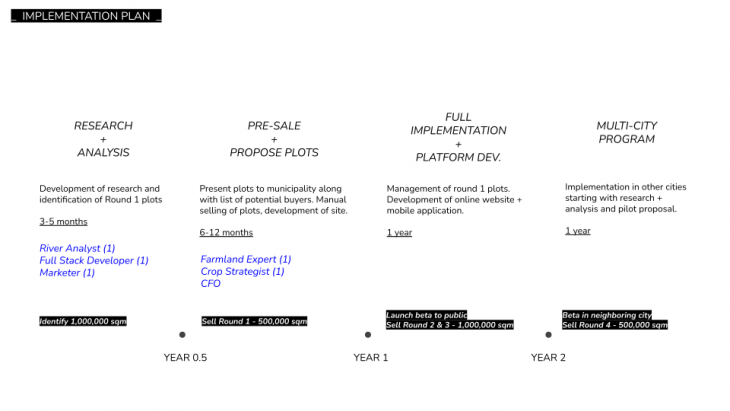 Research and analysis will be executed to find the first round of plots. This round will be done manually without the platform. Plots will be sold to farmers while the platform undergoes development. The next round will then be developed which will kick-off the 1 year pilot program. The next step is neighboring city implementation.