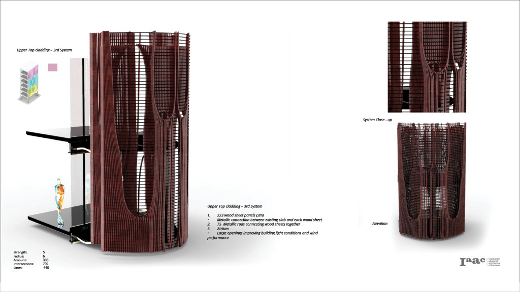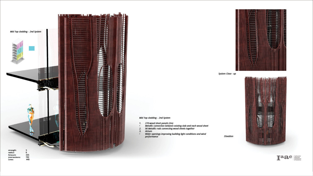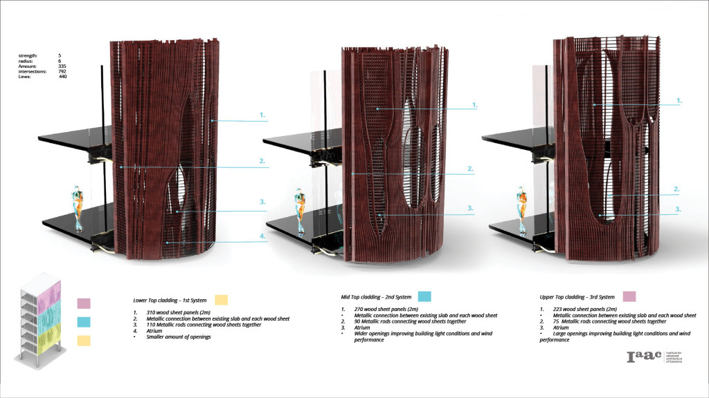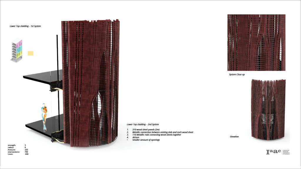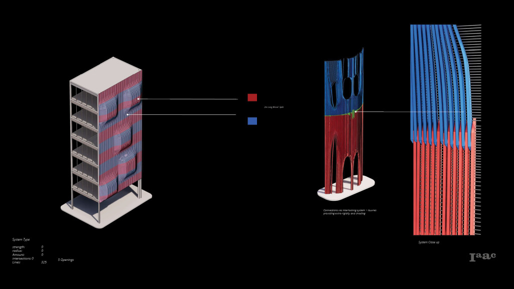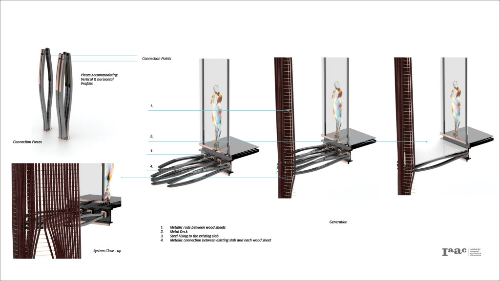 The project refers to active wood bending using robotic manufacture with a facade being the final aim of the exploration. The procedure is divided into three stages starting by streaming the wood, bending it with the use of the robot and finally mounting it in a position until the material gets back it rigidity. The investigation started with an analogue approach by steaming the wood then bending it with our hands on a fixed structure while it gradually evolved to a fully robotic process.