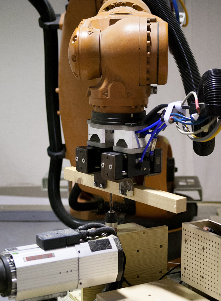 After cutting, the KUKA arm passes the stick into a manually controlled table-mounted drill. Specifically, the on-off switch of the drill is controlled outside of the KUKA room. Depending on the connection detail, the drill either drills through the entire batton or drills halfway.