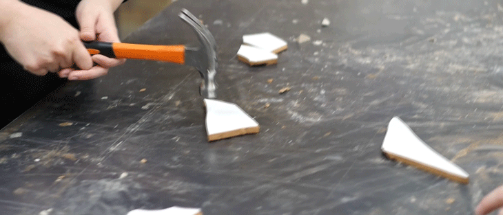We were given a set of ceramic pieces varying in size, due to the restriction of a single tile measuring 30cm x 30cm we broke several of the ceramic pieces to aim for an intricate and refined pattern.