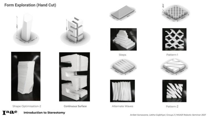 The aim is to understand the concepts of robotic fabrication and look into the world of stereotomy by using hot wire to cut EPS blocks.