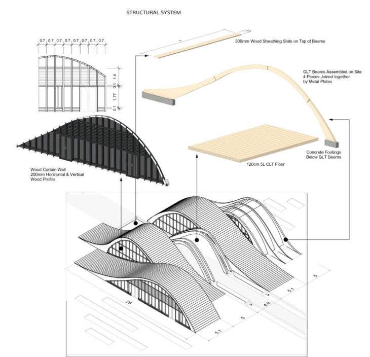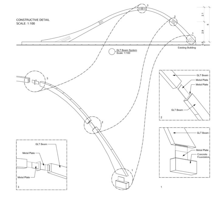 The structure challenges the timber material by creating uncommon curvature beams which will form the shape of the stripes. GLT beams divided and connected by metal plates will hold the form and connect to concrete footings. CLT floors will be raised by 45cm above existing building. Wood sheathing studs will cover the beams and hold the structure laterally.