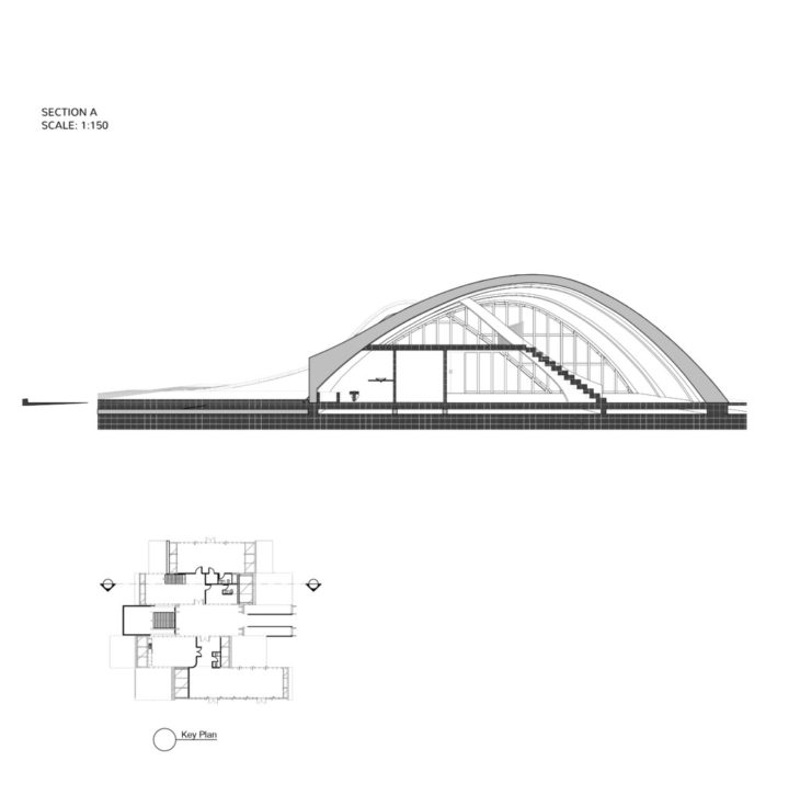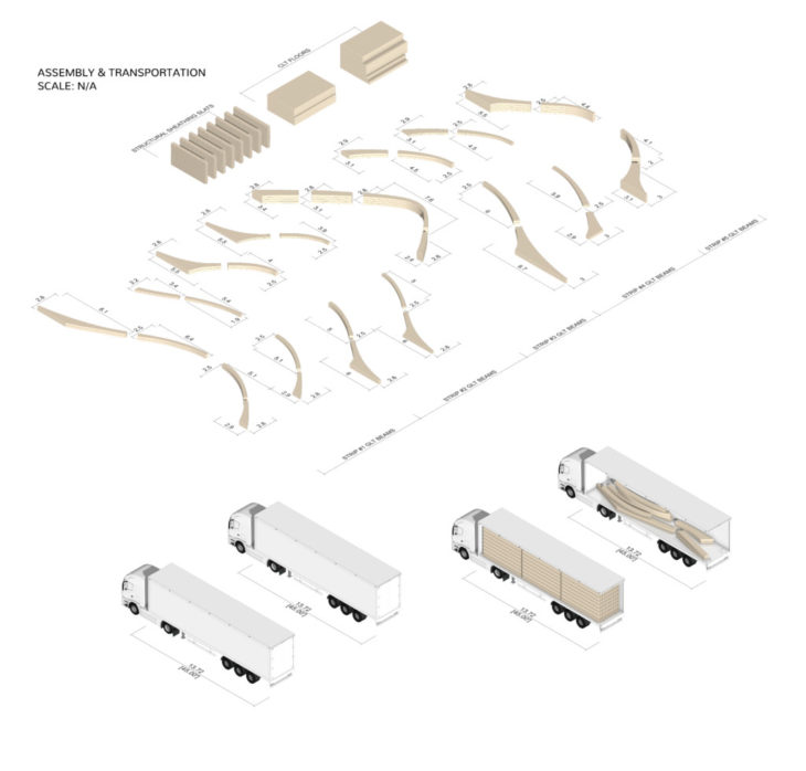 Using an existing building as a concrete foundation minimizes the amount of concrete used for this structure. The form comes to resembles peeling the rooftop of the existing building to form the “waves” or the stripes which will create spaces beneath them. Glue-laminated curved beams form the main structure of the stripes which will be bolted down to the foundation.