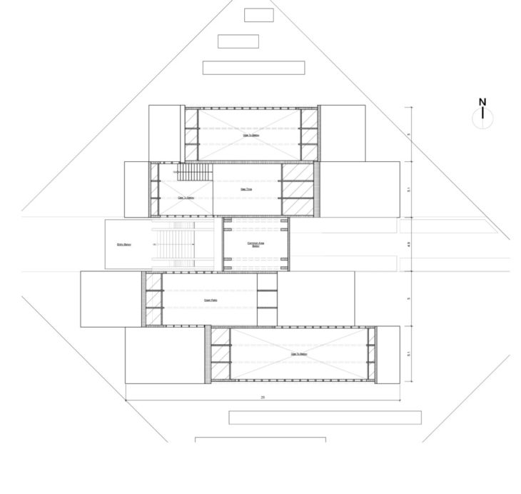 Open space airy floor plan with immediate connection to the outdoor. Main central axes connecting the north and south parts of the building, and connecting the rooftop to the existing building on the west.