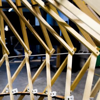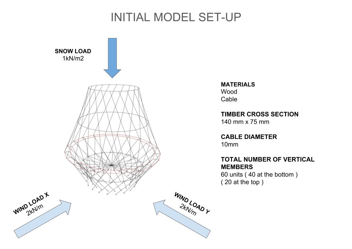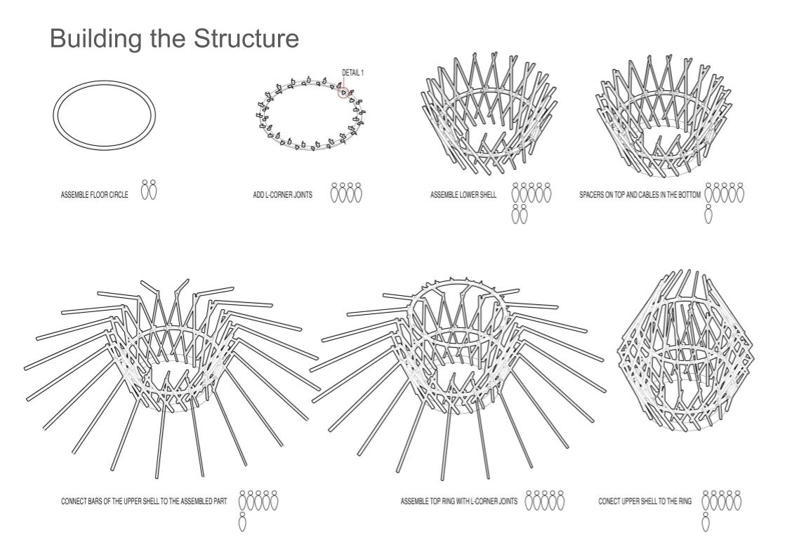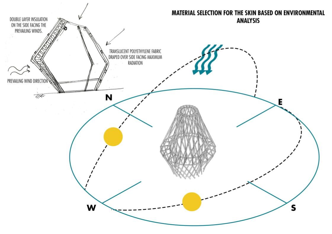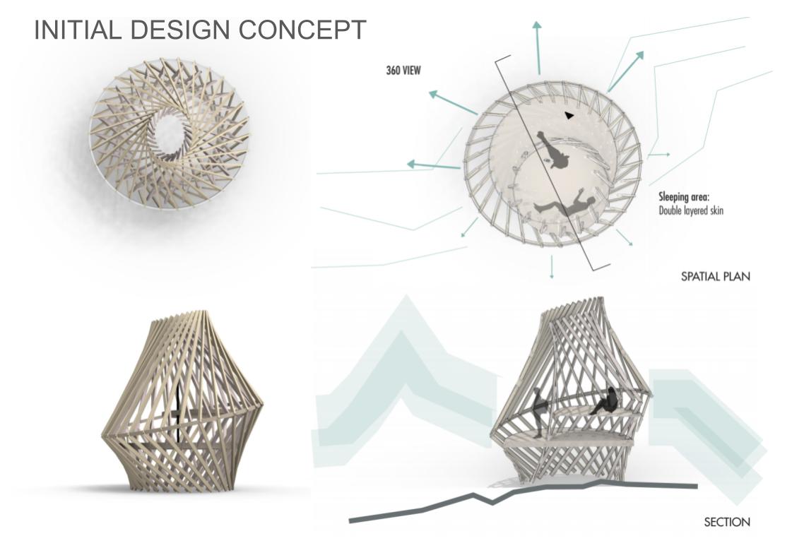 The objective of this workshop was to explore the feasibility of a ruled surface for our Himalayan retreat for 2 people. The main objective was to design a comprehensive structure using the principle of ruled surfaces with long timber members. While keeping in mind the structural requirements of the design such as harsh wind and snow loads, we also tried to keep the integrity of our concept of a Himalayan retreat: layers of comfort. The structure consists of two truncated cones made up of ruled surfaces placed on top of each other.