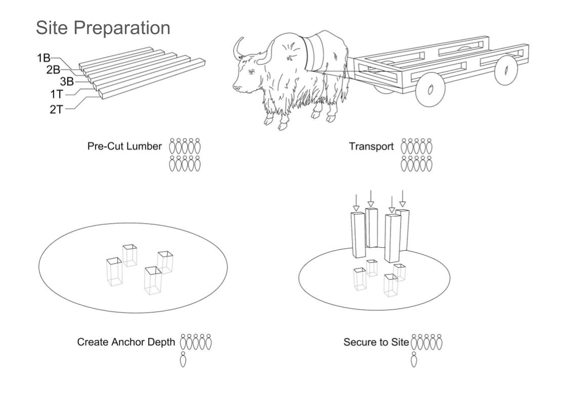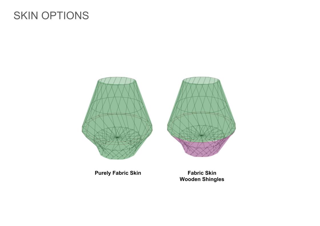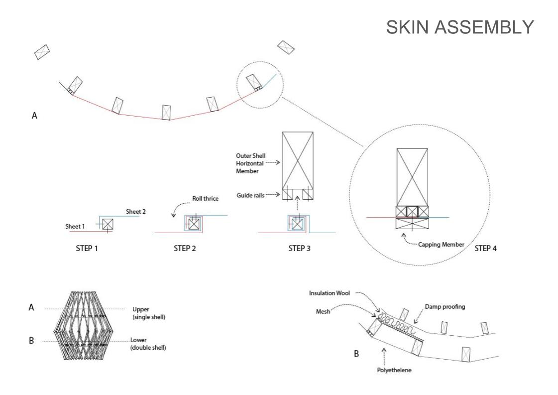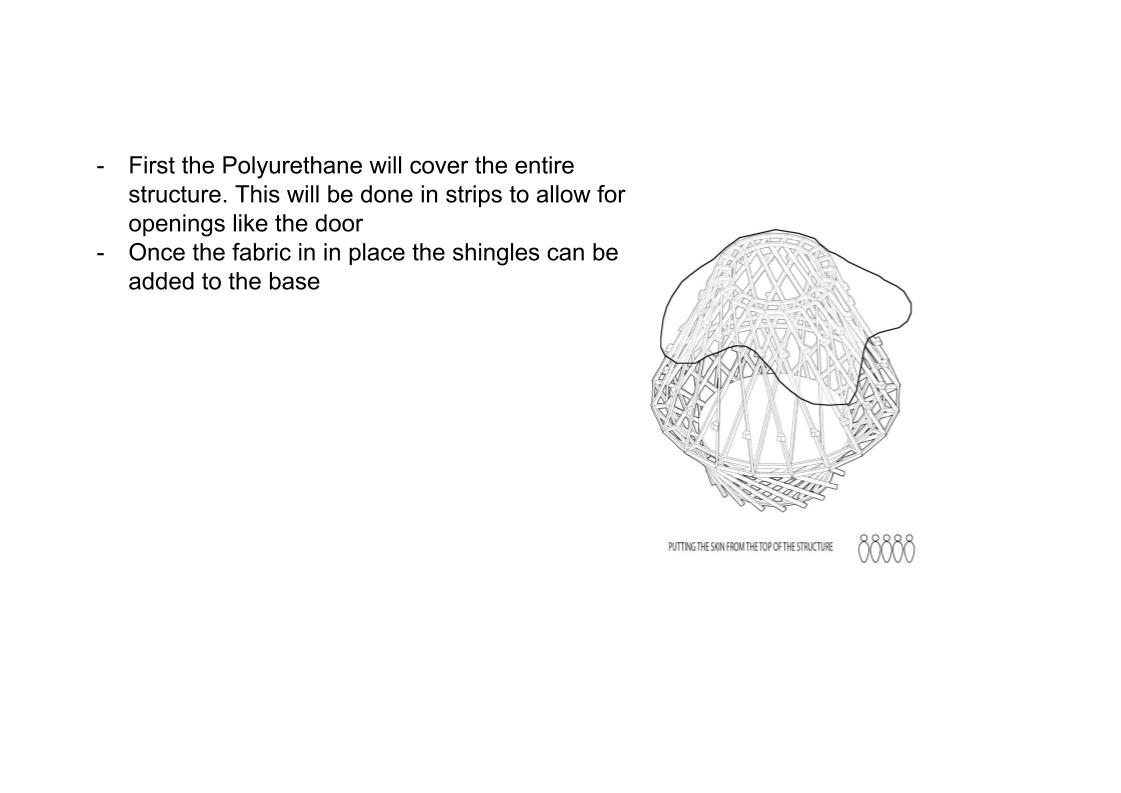 The structure is double skinned consisting of an outer polyurethane sheet on the outside and a damp-proofing on the inside with yak wool insulation between these layers. The polyurethane sheet not only acts as a waterproofing layer on the outside but also as an integrated structural system that wraps around the structure to resist wind loads. The PU sheets are pre-fabricated and wrapped around members that fit into niches in the existing structure which are then capped to be secured in place.
