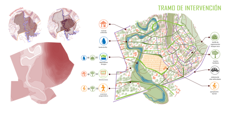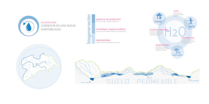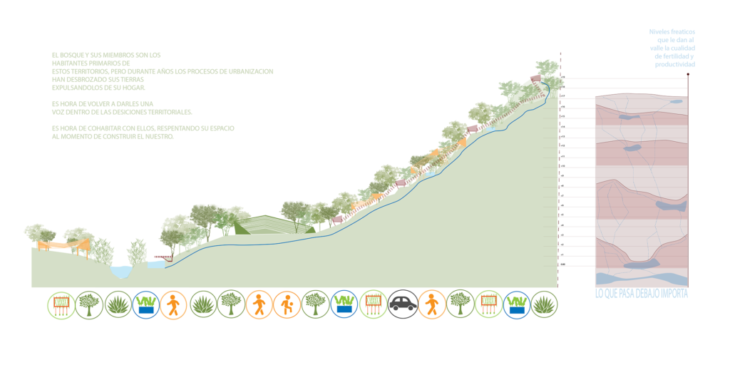 La propuesta parte de una pieza territorial la cual va de valle a ladera y genera corredores cuesta arriba donde plantea desarrollar arquitecturas en altura que liberen el suelo para que este mantenga su cualidad de permeable que le da a Guayllabamba su cualidad de fertilidad.