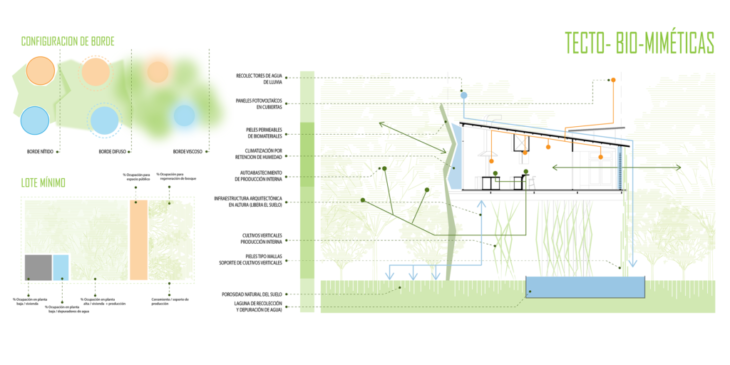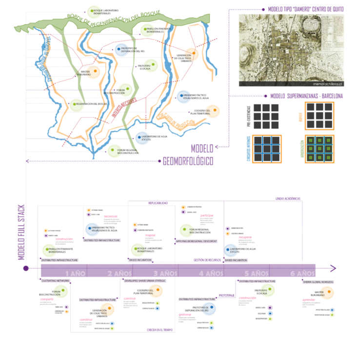 La reinterpretación del primario damero de Quito y las supermanzanas de Barcelona, en un nuevo modelo geomorfológico adaptado a territorios de geográficas accidentadas y morfológicamente heterogéneas, donde se consideran el tejido del agua como eje primario para el desarrollo de corredores e interconectores que configuran una nueva manera de habitar el bosque.