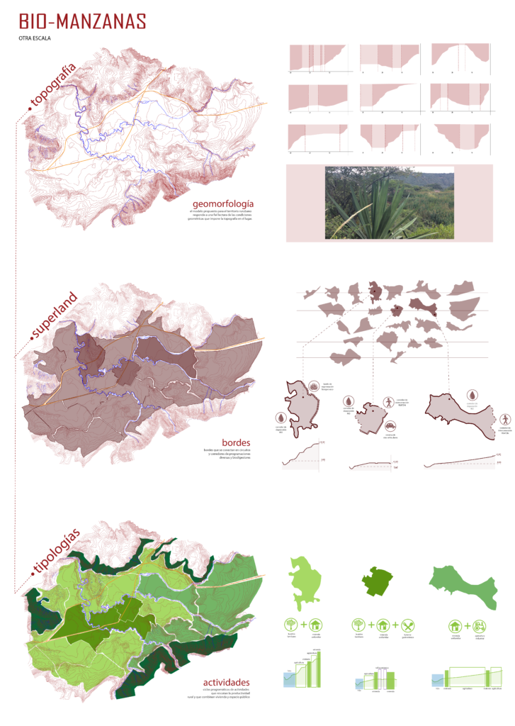 Las bio manzanas son piezas de territorio definidas por bordes con programaciones especificas y condiciones topográficas que evidencian la interrelación entre ladera y valle como condicionante para el desarrollo territorial. Nuevas geometrías heterogéneas y alabeadas que albergan distintos tipos de tipologías de actividades rurales.