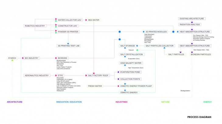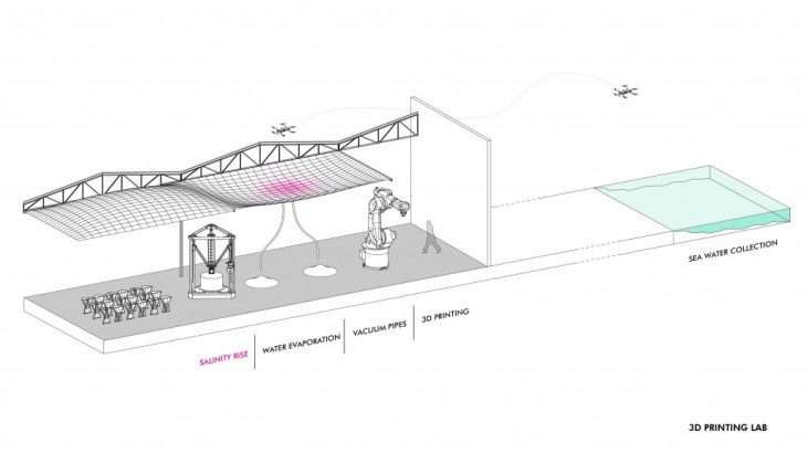 Salinity + deals with the use of sea water as in input for architectural design. This intervention is part of the retrofitting project that was proposed forthe new campus site in Barcelona. Why retrofit? The construction industry is the number one cause of man-made greenhouse emissions. Retrofitting an outdated building prevents the impact on the environment which would otherwise be produced be demolition, manufacturing, transportation and on-site operations. Salinity + revitalizes an old warehouse turning it into a salt 3D printing test lab. The sea water, dropped in the test lab’s ETFE roof ponds by drones, is used as an input for two different functions of the building. Firstly, it produces blue energy, after going through an osmotic power plant. The osmotic energy is used to recharge the drones and provides the energy for the 3d printers and the building itself. Secondly, it is mixed with bioresin, made out of starch, and used as a 3D printing material. The final products are semi transparent, heat absorptive modules used to retrofit the façade of a residential building on site that has high solar radiation levels. The modules protect from the high temperatures during the summer, and when the rain season begins they dissolve, and the salt is collected and reused.