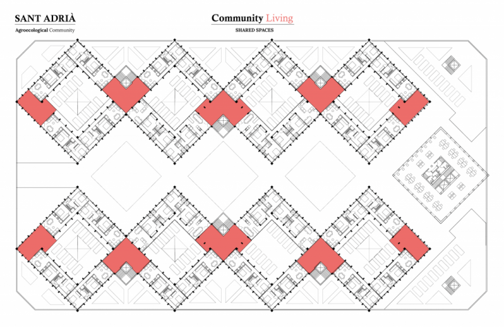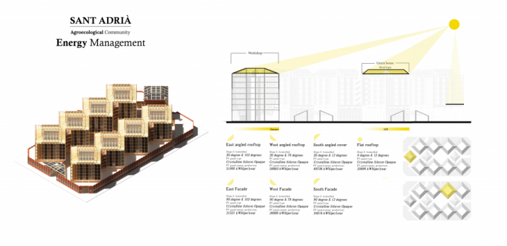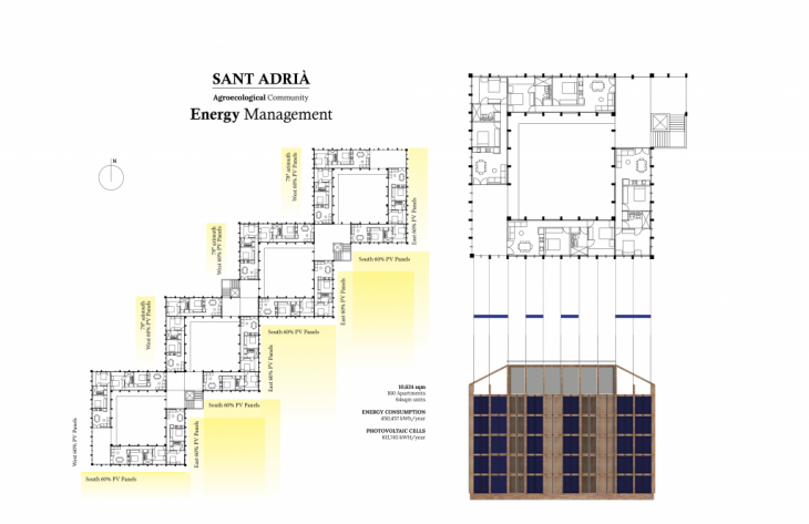 Self-sufficiency is commonly related to satisfying an energetic and water demand within the architectural space. In Sant Adriá project, solar panels, water recycle systems, rain caption and spaces for agricultural production are key elements to a new way of living. The project allows to gather 90.95% of the energy consumed by the residents and can supply the water requirements for the entire agricultural area by treating the gray water and saving the rainwater during the year. Technology is used an awareness tool rather that a consuming entity. We developed a system that measures the electrical consumption and give that data to the entire community, so the users are able to make conscious decisions about their consumption in order to get the free solar energy that the complex generates.