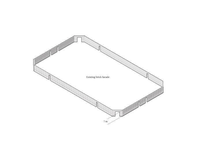 The form was achieved by understanding the environmental conditions and impacts of the project. We started by preserving the ground floor condition that a previous industrial project had. A brick façade will be the envelope of the new industrial and community ground floor, that also will be worked as the access for two housing structures if 160 apartments distributed in 5 levels. The housing structures are inclined according to the cardinal points to maximize the sun caption and let the façades to be treated according to its sun condition. To take advantage of the north winds and consider a passive ventilation inside the buildings, 8 courtyards were created to promote stack effect and cross ventilation inside the structures. Finally, as an agroecological project requires, the agricultural landscape was placed in the entire surface of the project. Greenhouses were distributed all along the rooftops and in the space of transition between industry and housing, an agricultural terrace was disposed.