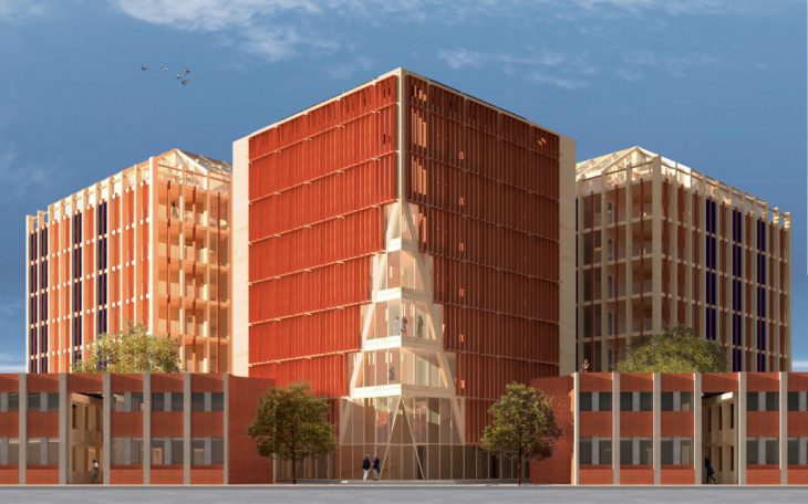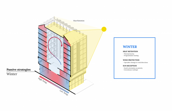 Comfort and sustainability are constantly placed as opposite concepts. Passive design works as a tool to achieve low environmental impact solutions that regulates the climatic conditions to accomplish human comfort. In Sant Adrià project, wind and sun were analyzed to shaped it. Slim apartments have the possibility to take advantage of cross-ventilation while the disposition of the housing structures creates inner patios that work both for summer and winter conditions. Materiality also plays a huge rol in passivity. The wood structure gives high thermal comfort. Ceramic louvers give shadowing in summer and retain heat on winter. Glass is used to promote stack effect in summer and to contain heat in winter inside the two-layer panels. Concrete in cautiously placed as flooring to preserve the radiant floor heat that works with the industry output. In general, comfort is perceived as climatic wellbeing rather that a consuming facilitation.