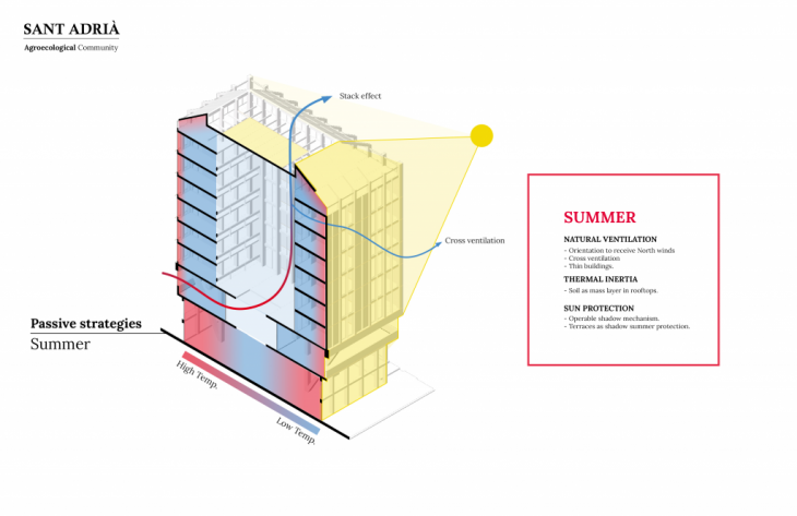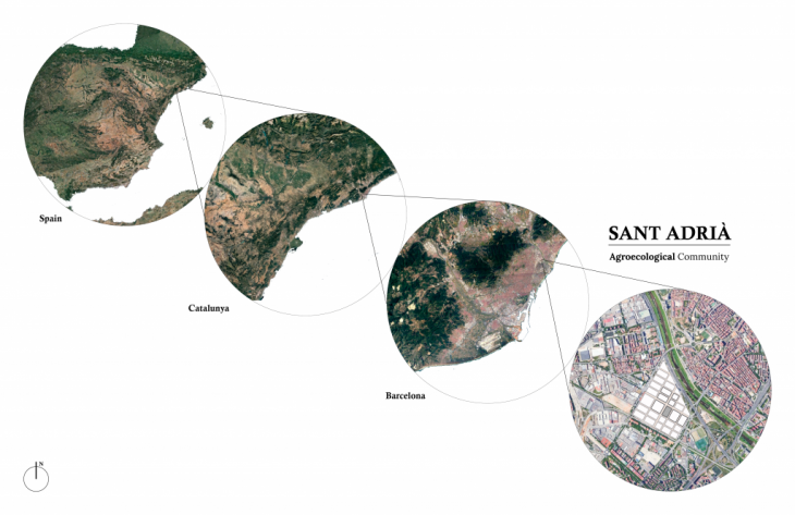 As the global environmental conditions are shaping the world with new rules, it is important to think of cities as places that promote an ecological interaction between the humans who build them and the natural space that still exists outside them. Sant Adrià Agroecological Community is a project that pursues this considering a terrestrial design approach. By terrestrial we assume Bruno Latour’s understanding of the earth as the subject of analysis when we think of the impact that our design decisions may have. By explaining this, we developed a methodology that shaped the project through 5 main topics: contextual opportunities, terrestrial design, community centered program, passive comfort, and self-sufficiency.