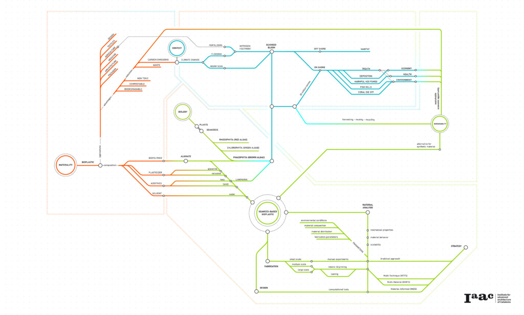 The research focuses on additive manufacturing seaweed-based bioplastic. The goal is to provide an alternative for synthetic materials that can lead to a new mediation between the built and the natural environment and potentially lessen the toxic waste cycle caused by overproduction.