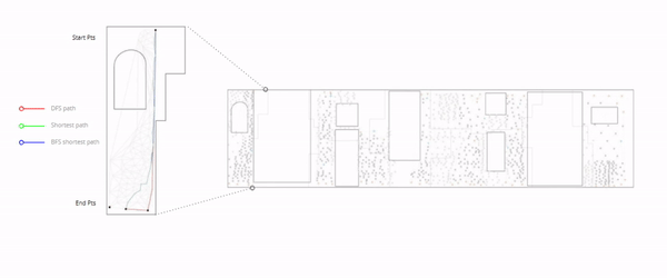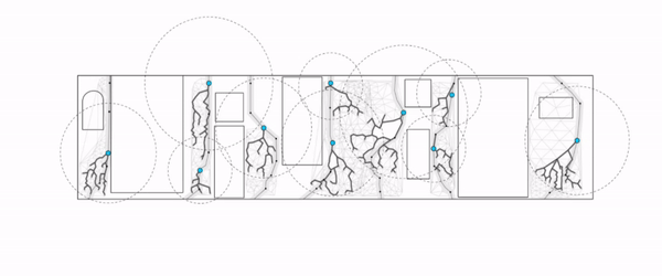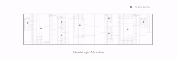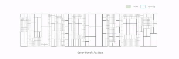 The existing wall is split by using a recursive subdivision, and the density and size of the panels are related to the openings of the building. The size of the panels defines whether they will have plants or not. Bigger panels have plants, whereas smaller ones are empty. The panels that contain plants are deeper. We are using the Manhattan Voronoi from the opening’s central points to split the facade and merge the panels into groups to be fabricated together. We use a path-finding algorithm for the structural layer to find the shortest path that covers the whole group generated in the previous slide. Finally, the water supply system’s design uses the central points of the bricks and stones, making sure that it covers all the planted cells of each group.