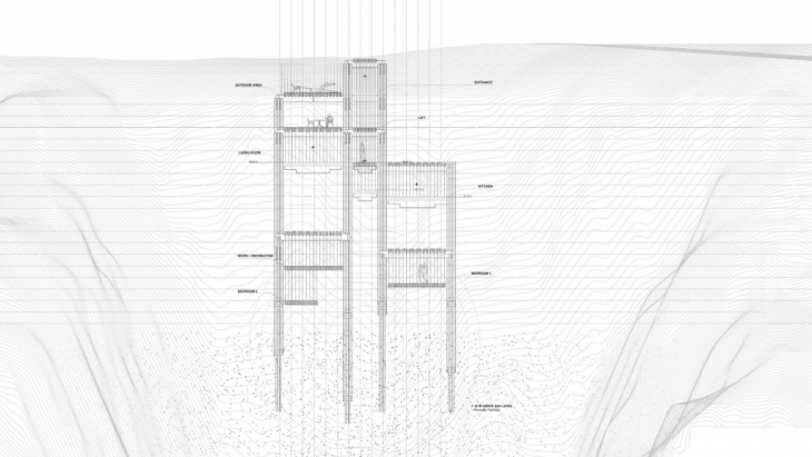 The proposal explores the idea of vertical circulation. As this living module is accessed from above, its inhabitants move around throughout the day by the moving platforms of stretched latex and elastic rooms.