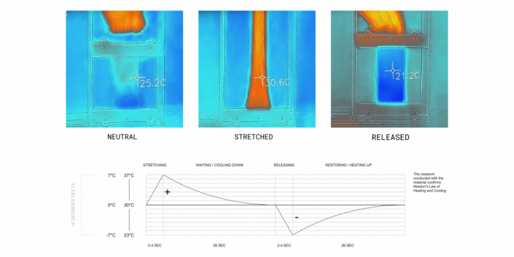 When it is stretched, it warms up 7 degrees above ambient temperature in seconds, but if left to cool down while stretched and released it drops 7 degrees below ambient temperature.