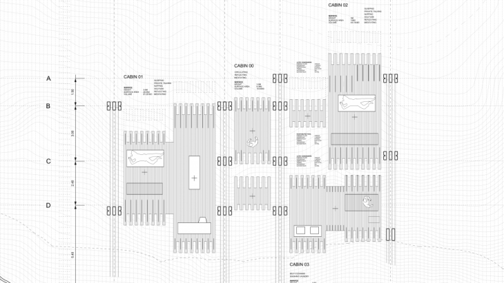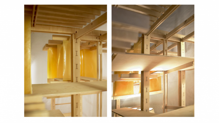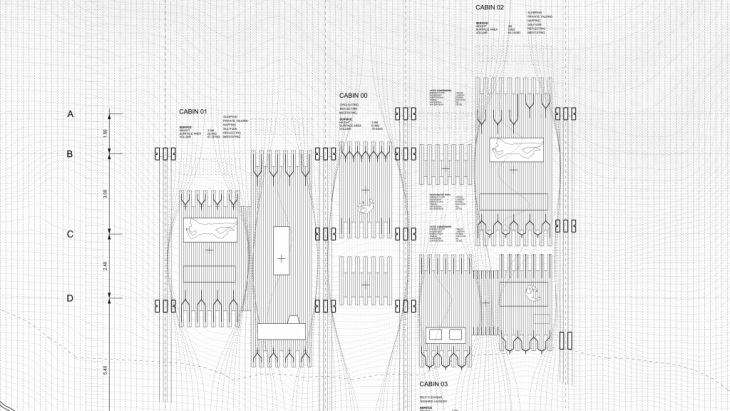 Each cabin has a water counter-weight that is triggered by the weight of a single human body – the project takes advantage of the proximity to the sea by using the seawater to stretch the latex in order to create fluid spaces.