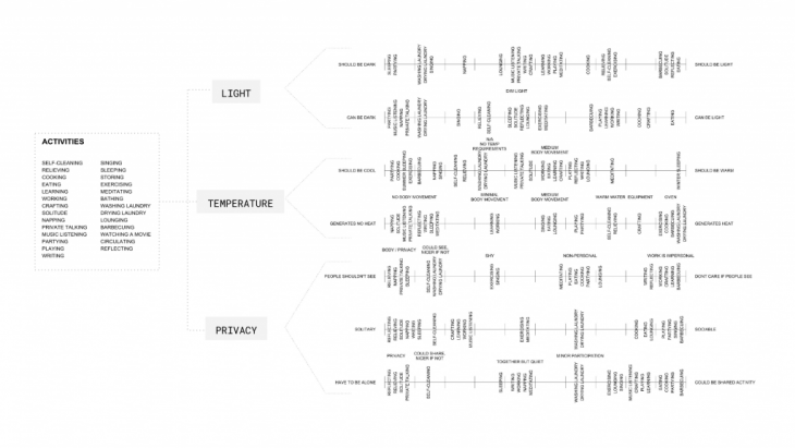 The program of living is therefore divided into activities that are classified on ranges of dependency and tolerance of light, temperature, privacy, ventilation and space and are clustered into a network of elastic spaces.