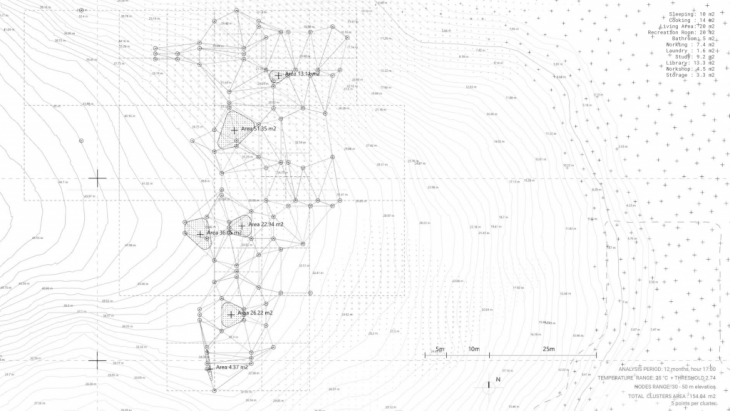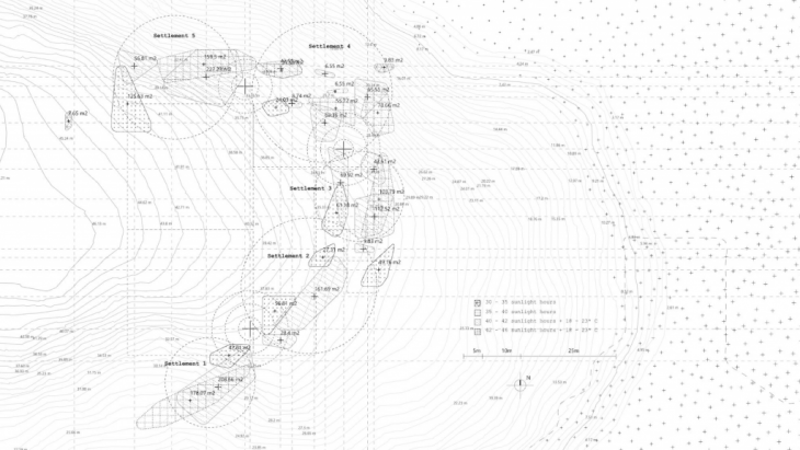 Based on those determined ranges of dependency, site specific points which meet the criteria of receiving most hours of direct sunlight exposure throughout a year and that are located at an altitude between 30-50 m, start forming clusters of potential settlement locations.