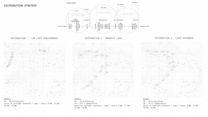 The programmatic distribution is therefore dependent on each of the spaces’ light requirements and circulation paths.