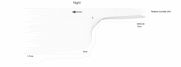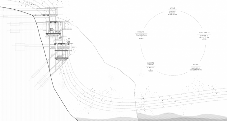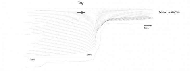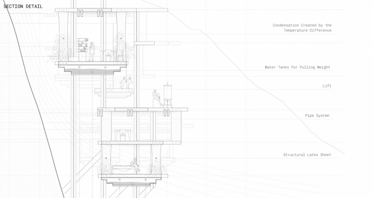 The project is understood as a filter that activates with evaporation and condensation by allowing windflow and humidity to pass through