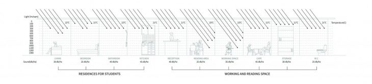In the afternoon, those spaces become work and study areas. The surfaces gain depth in order to reflect sound and prevent echoes. In the common workspaces a lot of light is let in, and the west facing wall now acts in absorbing heat, responding to the increase in temperature.
