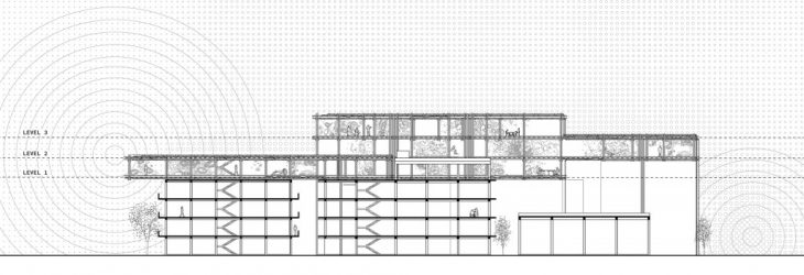 The overall section relates our plug-in structure to the existing buildings and the connection between levels.