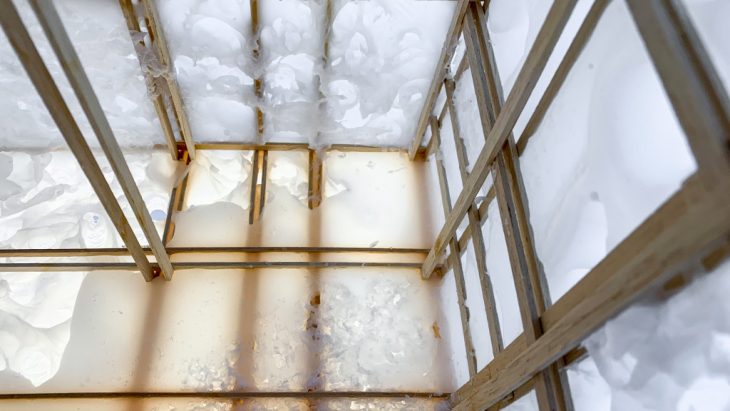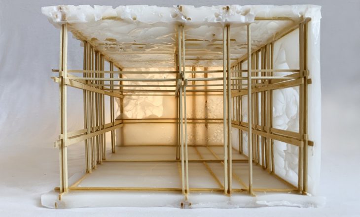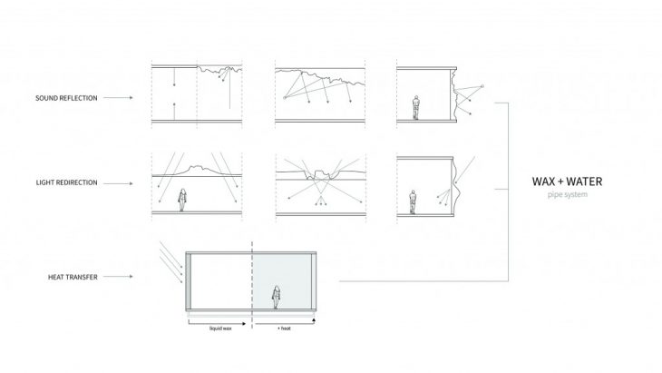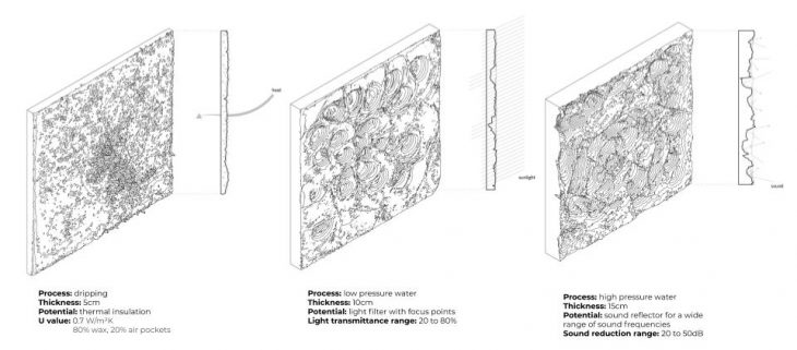 Paraffin wax is known for its thermal capabilities. When mixed with water, it solidifies and results in geometries ruled by temperature, pressure and volume. The resulting surfaces have a range of applications in architecture: light filtering, sound reflection or thermal insulation.
