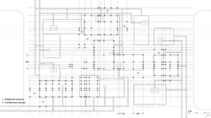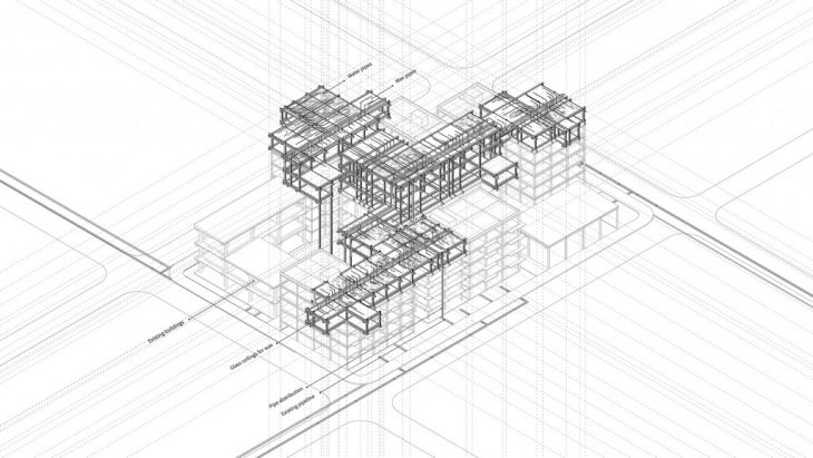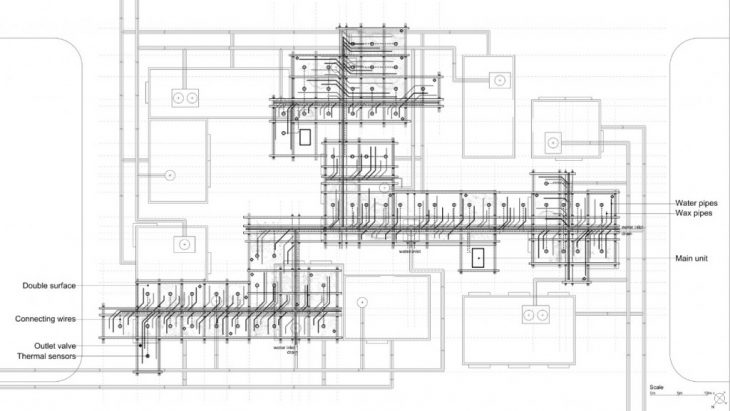 The existing structural grid was studied in order to understand how the new structure could be inserted on top of the buildings. A system of water, wax and drain pipes is controlled by valves and thermal sensors throughout the building.