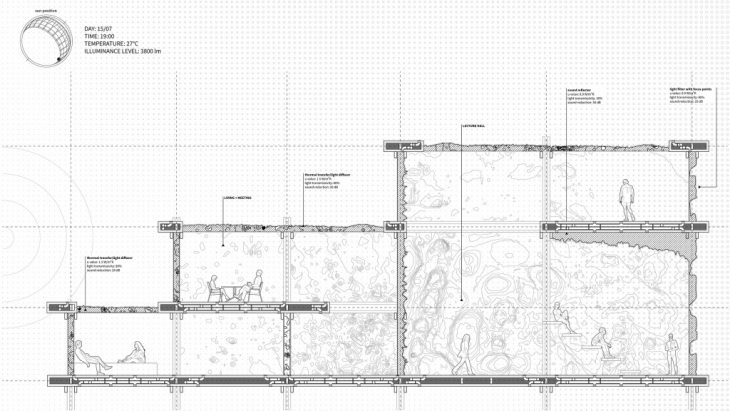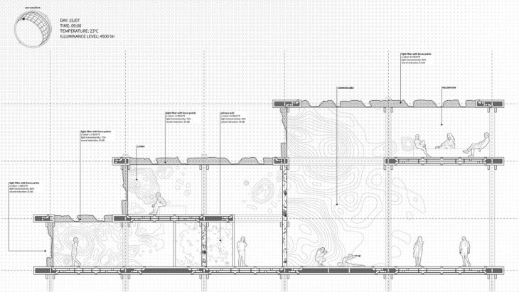 In the evening, most of the surfaces start acting in light diffusing and transferring temperature. The common area becomes a lecture hall, with surfaces that act in sound distribution.