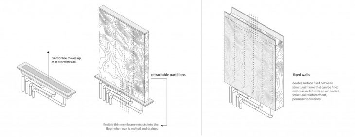 The wax has to be contained when it’s liquid, so we have two typologies of partitions in order to make some parts of the building completely flexible. The partitions can be retractable, and move up when they’re filled with wax, or fixed between the structural panels.