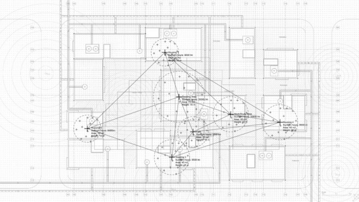 The site is a series of roofs within an urban context. The energies in the site were mapped (sunlight radiation and sources of sound), and also the existing infrastructure (water and drain pipes, water tanks, existing vertical circulation) in order to understand how the system can be attached to them.