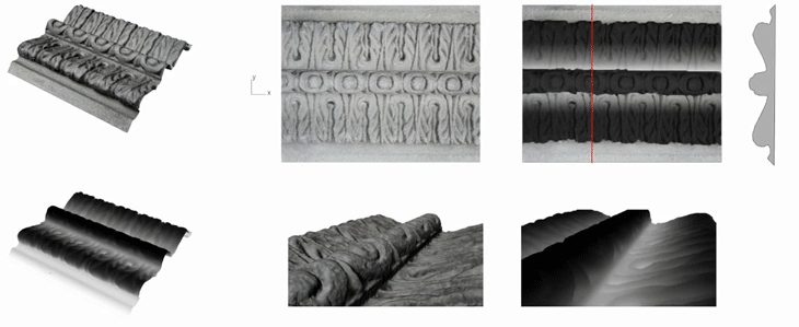The creation of these bump-maps could be used to regenerate the exact topology onto any other object. To manipulate and make the final application one step more abstract and less a copy of the existing, it was decided to continue the next steps by extracting single sections of these maps and investigate the use of those for the potential use as profiles by extrusion.