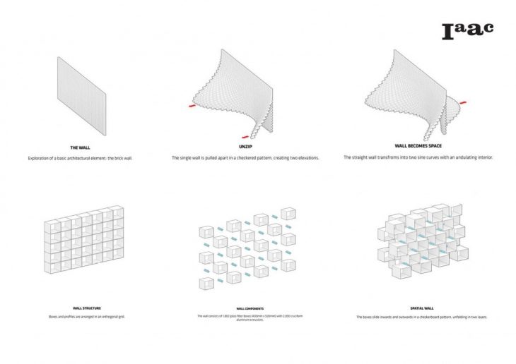 The surfaces are formed from a series of 500 mm by 400 mm bricks. The length of each brick is such that it overlaps its neighbours sufficiently enough to create an enclosure, whilst also providing sufficient connection length between adjacent bricks for structural purposes. The transition from two separate halves to a single surface at the apex was achieved by arranging the boxes in alternate chequerboard patterns on either side of the wall, allowing them to merge seamlessly.