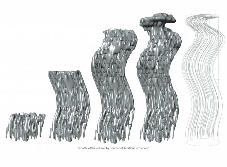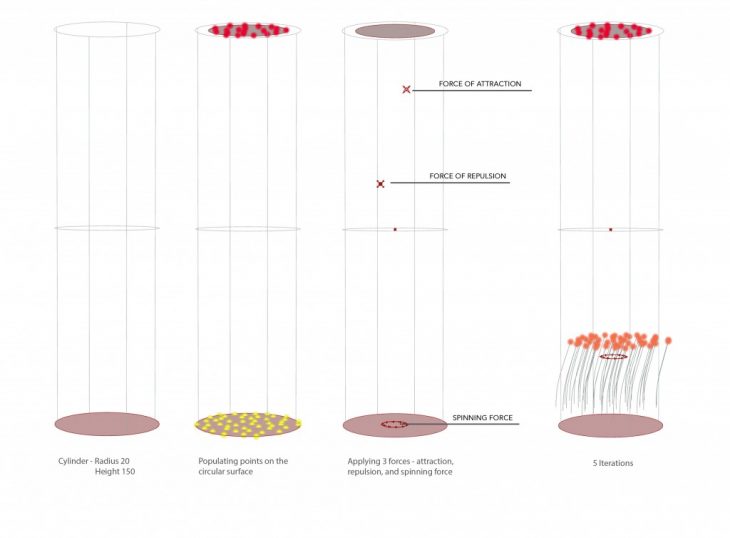 All agent based proposal are applied in a cylinder with a radius of 20 and height 150. A stigmergic environment is generated applying forces of attraction, repulsion and spinning. Together with all the forces the populated points are flocked to the geometrical center resulting into a column informed by a specific stigmergic environment.