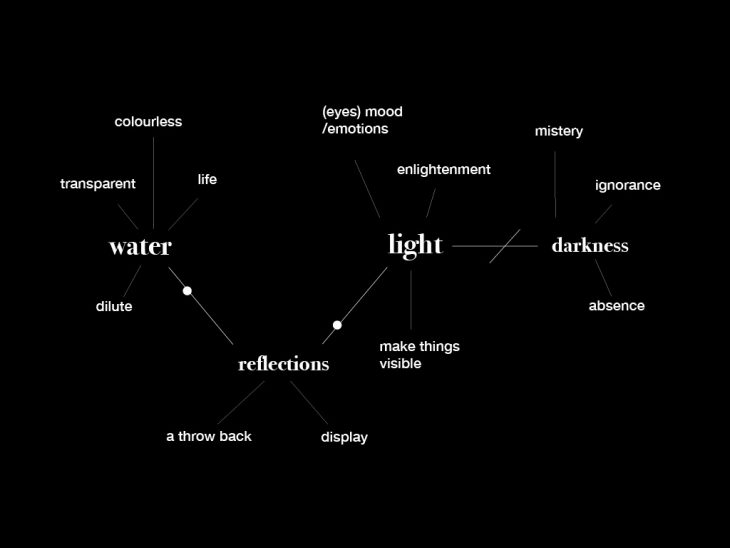With our keywords, water and light, we designed a conceptual map around them. The associations related to them, helped us thinking further about the esthetic of the hole installation.