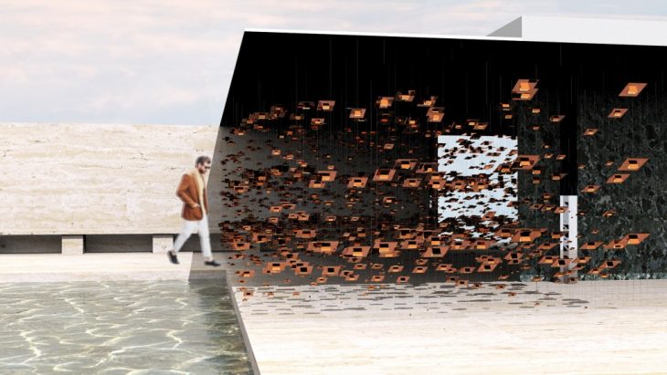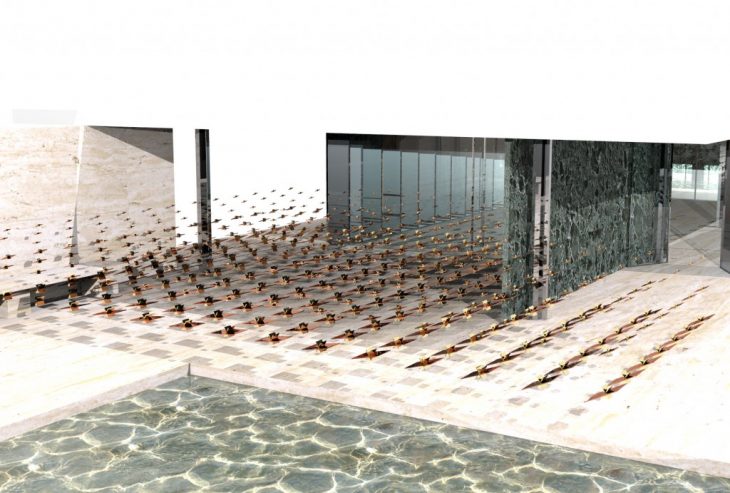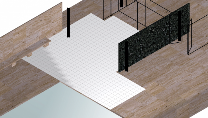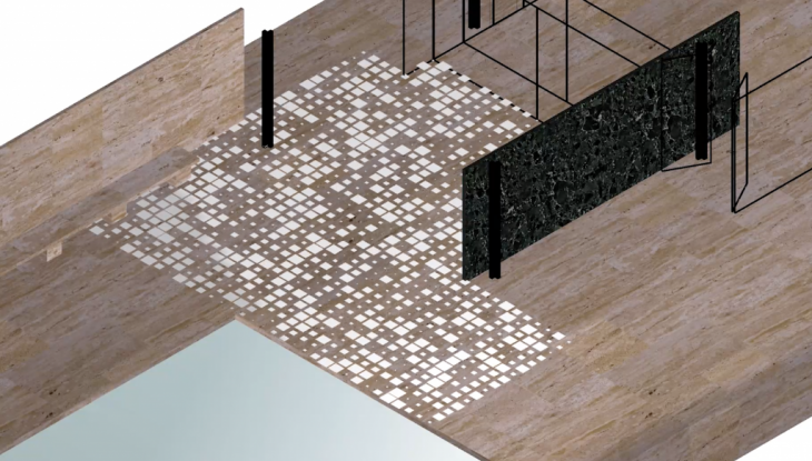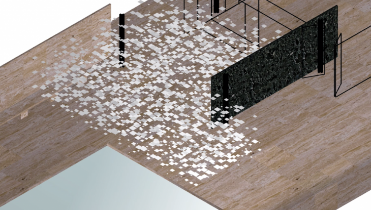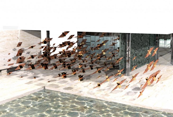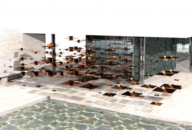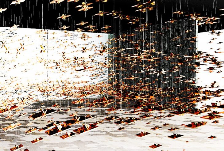 Geometrically, planar shapes grow from ground up to fill three dimensionality. Similar polygonal surfaces are scaled, moved and rotated around their own axis to attain suspended fragments distributed in the air.