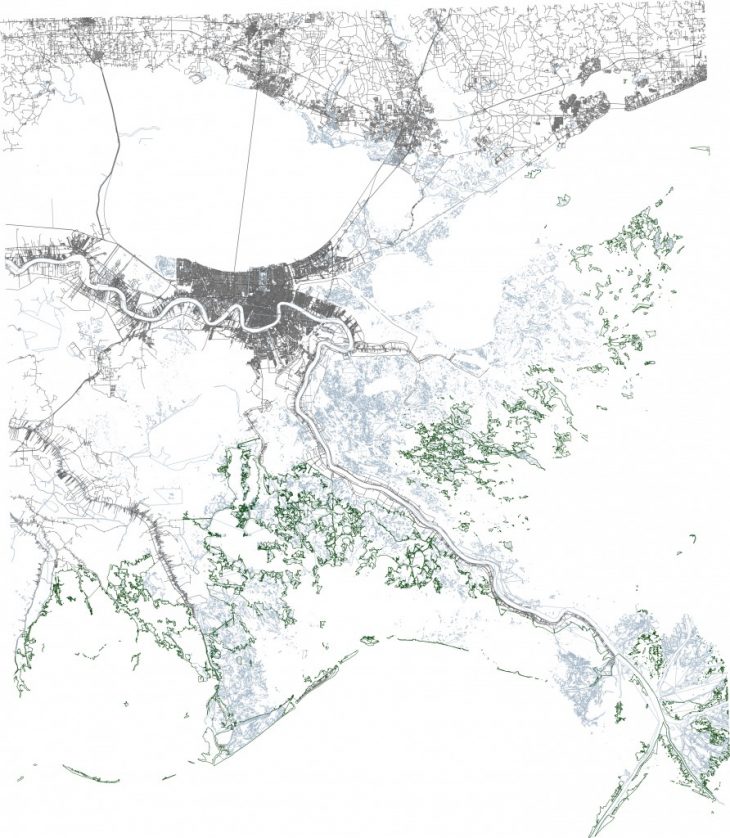 The impacts of hurricanes Katrina and Rita in 2005 and Gustav and Ike in 2008 caused 850 square kilometers of coastal land loss throughout the state of Louisiana.Their powerful winds and excessive rainfall which can result in surging floodwaters uplift the soft sediment of the wetlands, changing the topography and water flow, and subsequently, the water chemistry. In order to better analyze the progression of water and land flow, it is necessary to look outside of the city, to the surrounding coastlines. As shown by the satellite images from 2004 to 2009 (right), the water-to-land ratio has increased significantly. While the City of New Orleans is taking steps to rectify this land loss, solutions are too slowly enacted. Therefore, a new, multi-layered approach is necessary to study, asses and design a plan viable enough financially yet permanently effective.