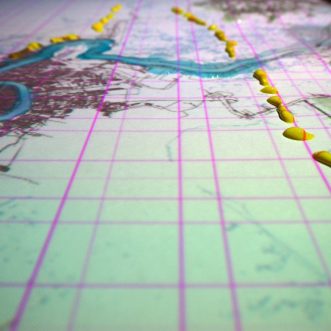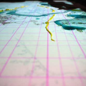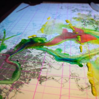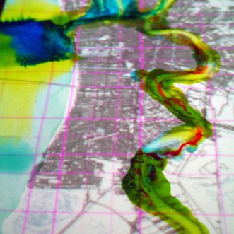 In order evaluate the impacted zones throughout the city and surrounding areas, water flow simulations were made using ink and water color pigmentations. Water is placed on a scaled map of the city, such that topography and water paths are generated through warping of the paper. Pigmentation is then systematically introduced, starting from showing intersection points between the river and main water bodies. Different pigments are then added, to show specifics such was water flow and direction of the hurricane, before an overflow is introduced to map the aftermath of the hurricane and possible scenarios with regards to redirecting the water.