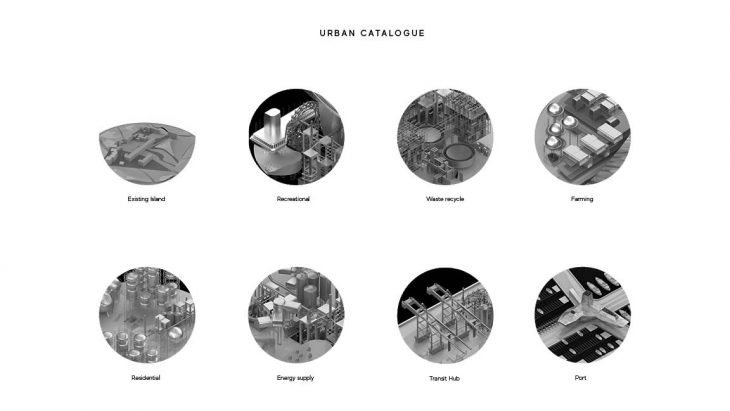 An urban catalogue was developed in order to make floating self-sufficient blocks which were imagined as isolated city blocks. This would make the proposed network capable to grow and disintegrate as with time and consumption.