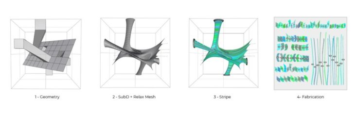 The focus of this studio is to explore mesh geometries and how they affect mesh topologies. For the first step, the team explored two kinds of minimal surfaces and different mesh subdivisions within. This study was crucial to understanding the effects of subdivisions to the mesh relaxation as well as the striping.