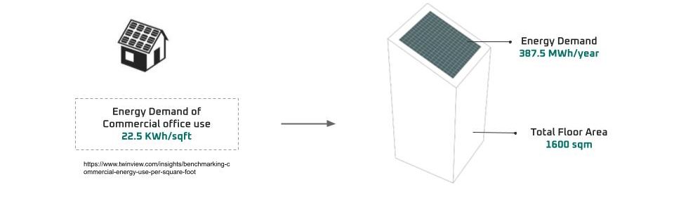 Energy demand of a commercial office use is approximately 22.5 kwh/sq ft. In our case total floor area is 1600 sqm and it approximately require 387.5 MWh energy annually.