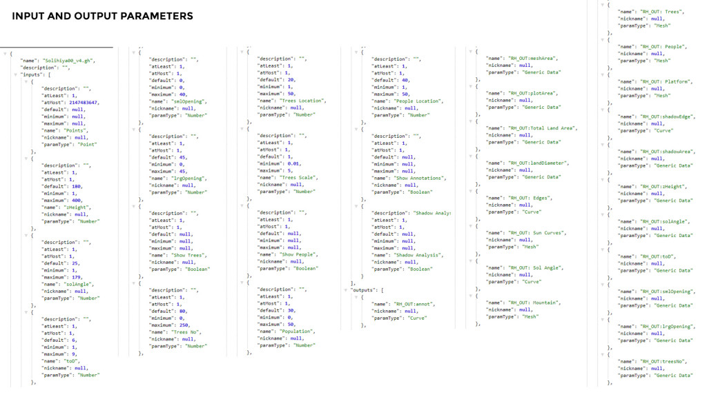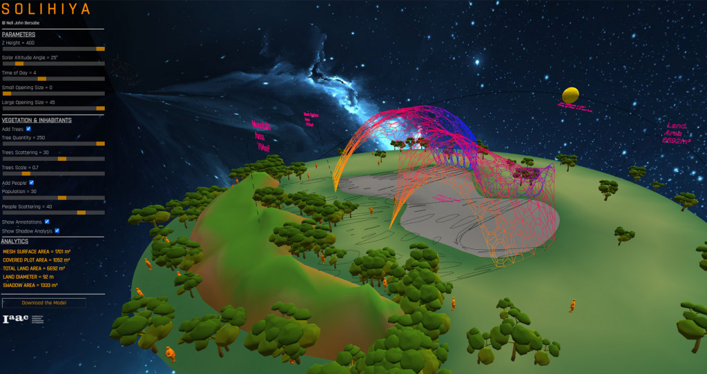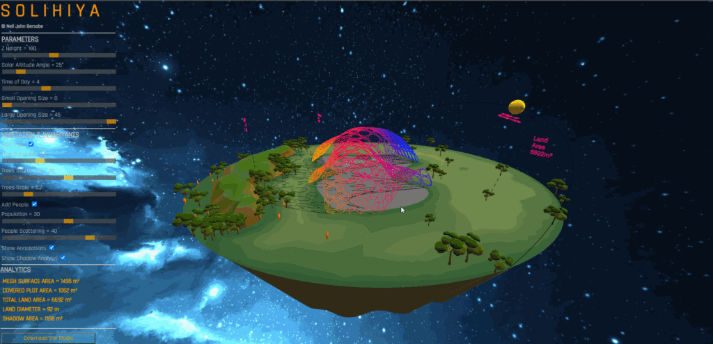 Solihiya is a parametric pavilion configurator based on the Philippine sunburst weaving pattern of the same name. The configurator aims to give users feedback on the implications of different parametric configurations to the pavilion-like height, openings, and solar parameters. This also gives users insight into different shadow patterns and behaviors depending on vectors got from solar angles and times of the day. A color gradient is applied to the mesh edges of the pavilion corresponding to the distance from the sun.