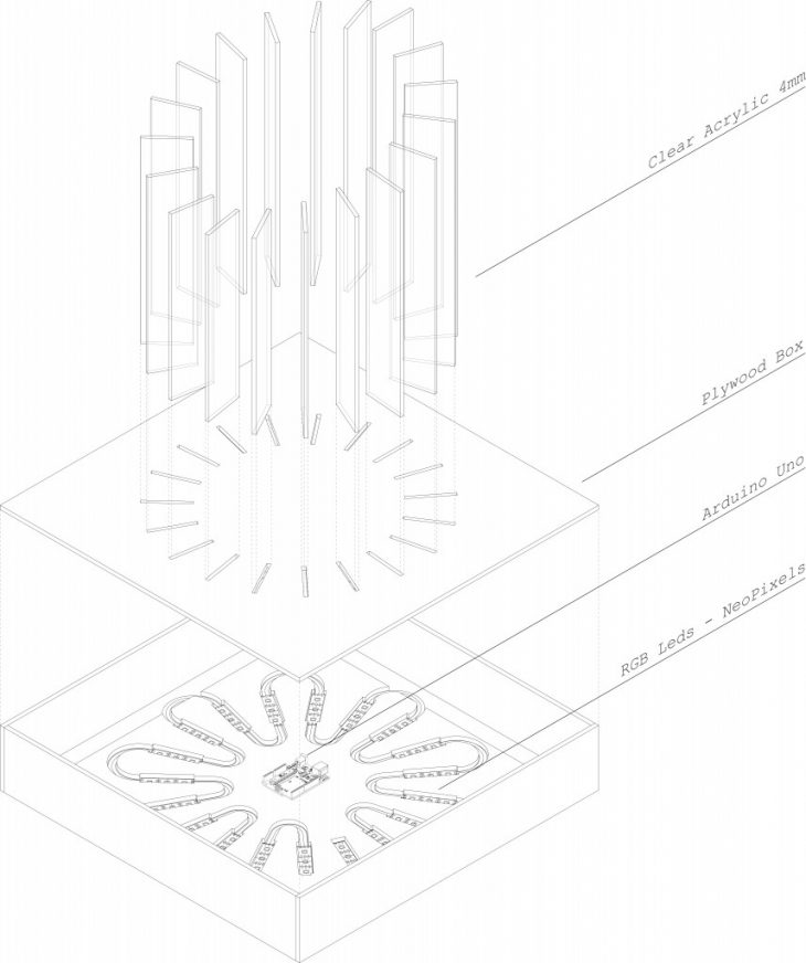 A linear strip of Neopixel LED is cut into 19 strips comprising of 3 Leds each are soldered together to give circular shape. Laser cut plywood is pasted at base of wooden box to keep Leds in place. Arcylic spacers are used to maintain a continuous distance between laser cut sheet & for keeping acrylic strips upright. After fixing the lights in place; hollow box is capped with another laser cut square with slots to slide in acrylic.