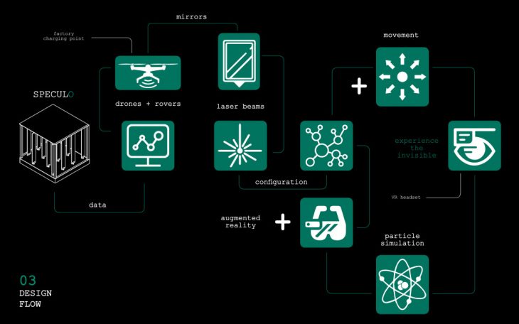 Speculo V.2 aspires to raise awareness but mostly to make invisible the layers that contribute to the high levels of pollution on site. By creating an interaction between the human and the digital environment, the project raises the question of how humans can impact the surrounding environment and how the unseen can become an experience.