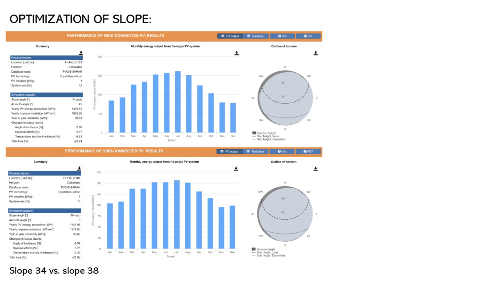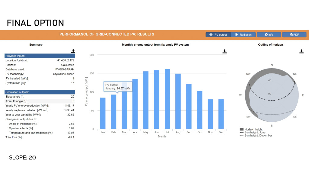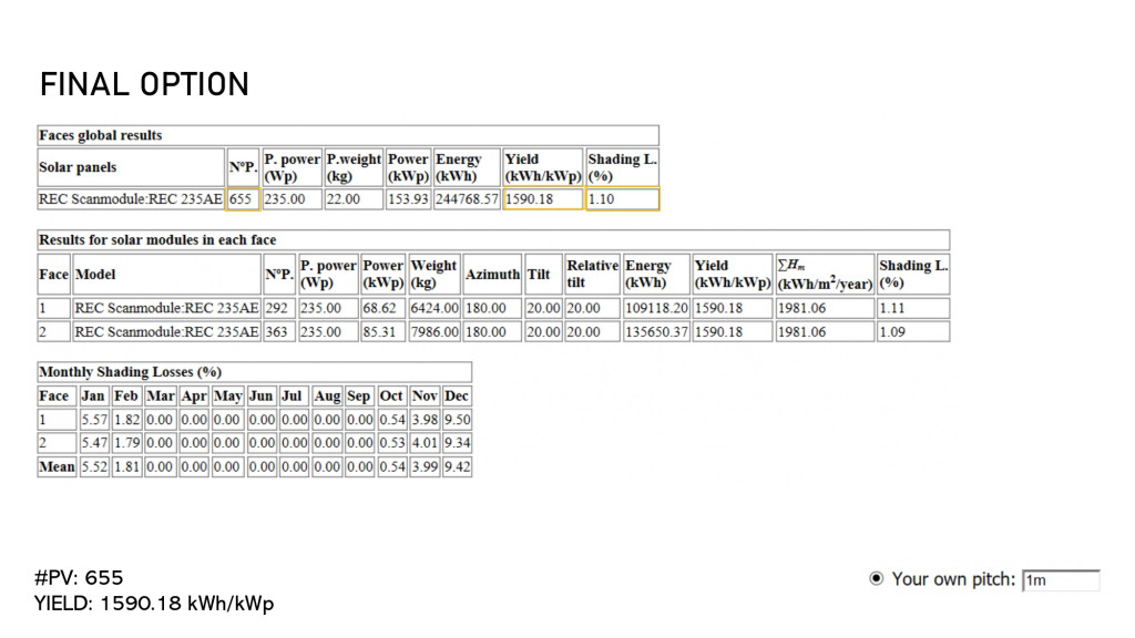Our final option consisted of 655 solar panels yielding 1590 kWh/kWp with a shading loss of 1.10% and a pitch of 1 m. Our solar ratio with this option came to be 41%.