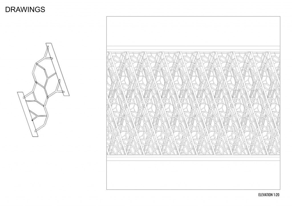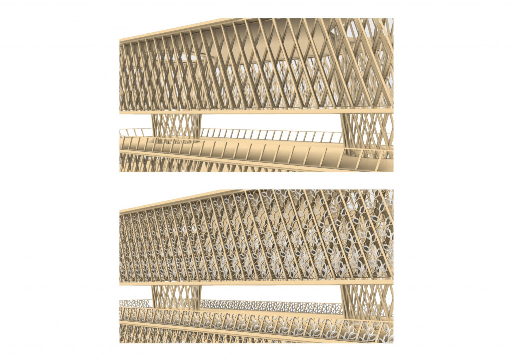 Following the trusses developed in the ecosystemic structures, we used these as the central veins. We developed a pattern that structurally responded to the need of the facade.